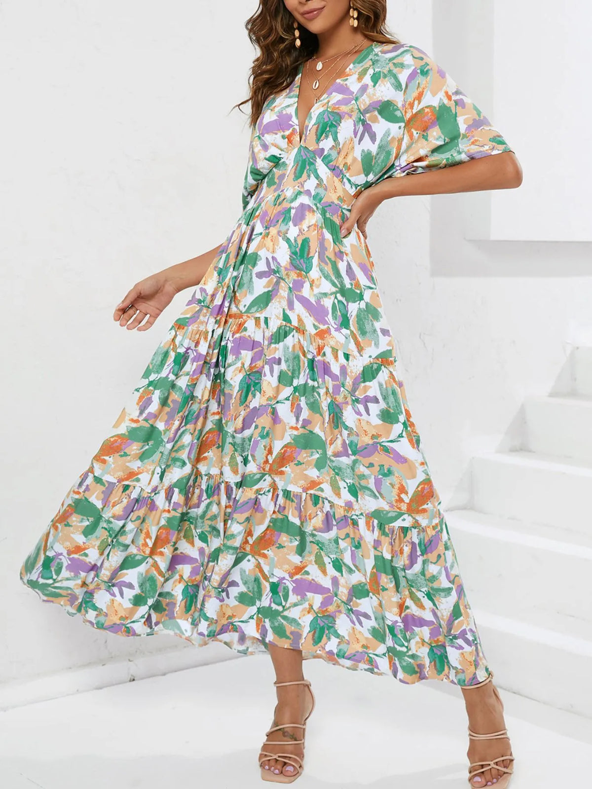 Floral Print V-neck Boho Midi Dress - Gum Leaf / S