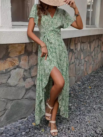 Printed Surplice Maxi Dress with Flutter Sleeves - Green / S