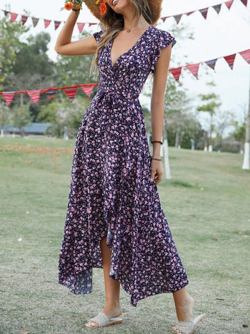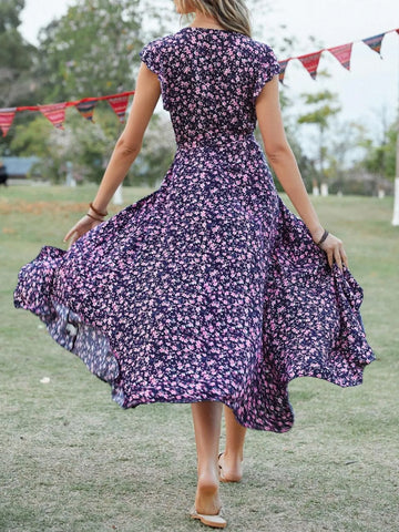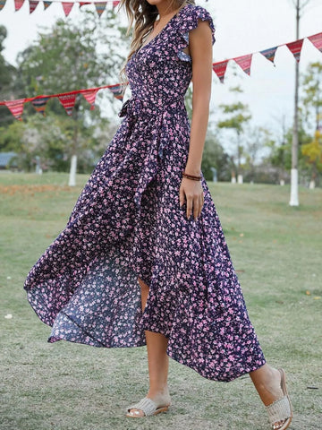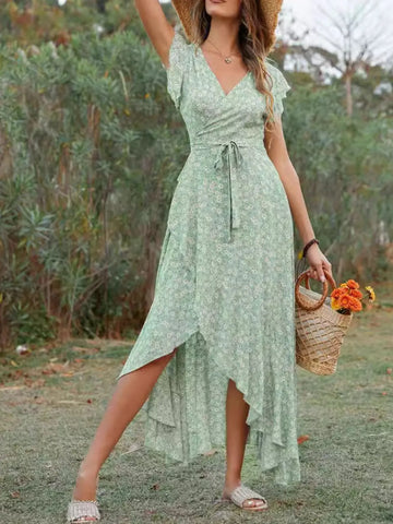 Printed Surplice Ruffle Sleeve Dress - Green / S
