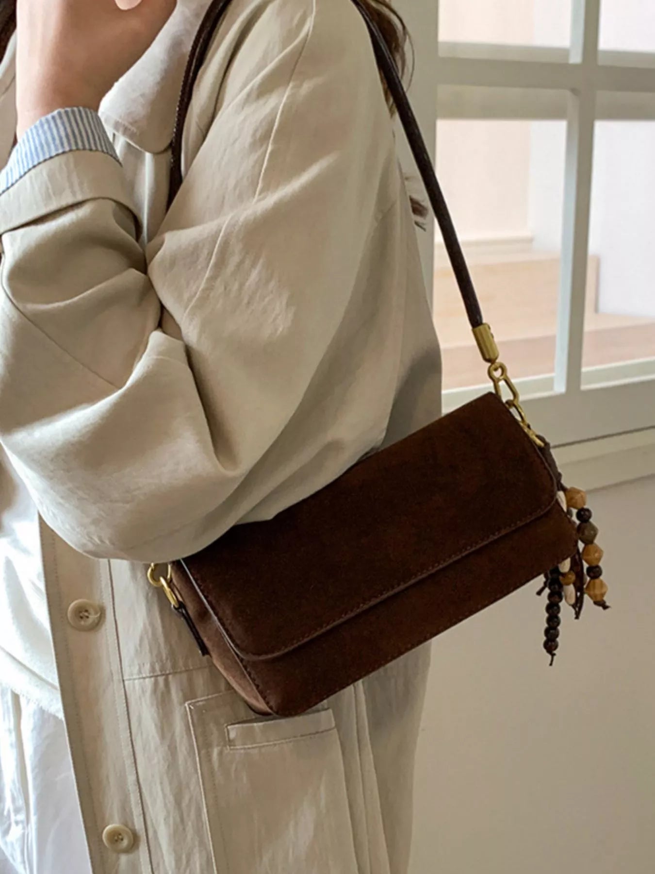 Adjustable Strap Flap Shoulder Bag - Brown / One Size