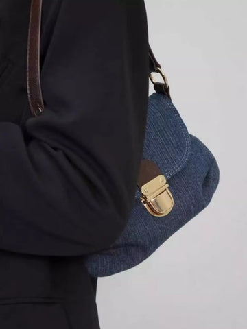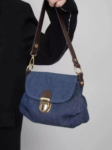Denim Flap Shoulder Bag with Golden Clasp Sale