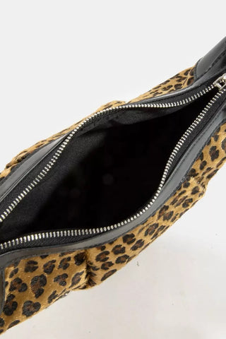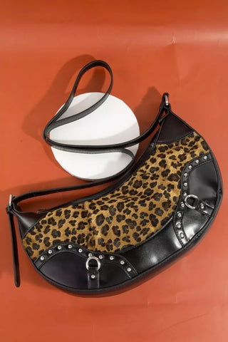 This stylish shoulder bag features a fashion leopard print design, accented with studded detailing for an edgy look. The hobo style offers a relaxed and comfortable fit, while the adjustable shoulder strap allows for customizable wear. Crafted from durable materials, this bag is perfect for everyday use. The zipper closure ensures the security of your belongings. Its versatile design makes it suitable for various occasions, adding a touch of fashion to any outfit. The bag is made of faux leather and faux fur.