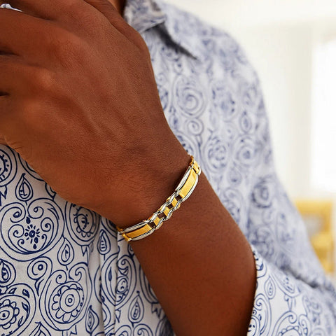 Curve style connectors accent rounded cut-out bar links with alternate hues on this sophisticated Mens bracelet. An 8 1/2 inches beauty crafted in fine 14k white and yellow gold and secured with a lobster style clasp.