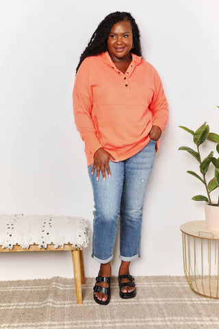 This solid hoodie features a quarter-snap closure, adding a stylish and functional detail. The hooded neckline adds a casual and sporty vibe to the hoodie. The dropped shoulder design gives it a relaxed and trendy look. With its long sleeves, it provides warmth and comfort. This hoodie is a versatile piece that can be worn for various occasions, from lounging at home to running errands or even for a casual outing with friends.