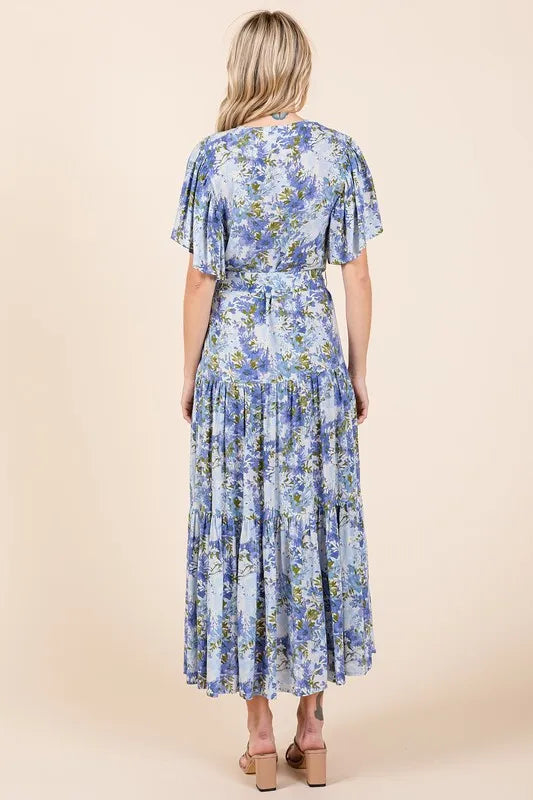 Mittoshop Floral Tie Waist Flutter Sleeve Tiered Dress - Dusty Blue / S