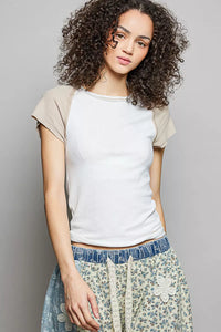 POL Round Neck Outseam Detail T-Shirt with Contrast Color Sleeves - IVORY/LATTE / S