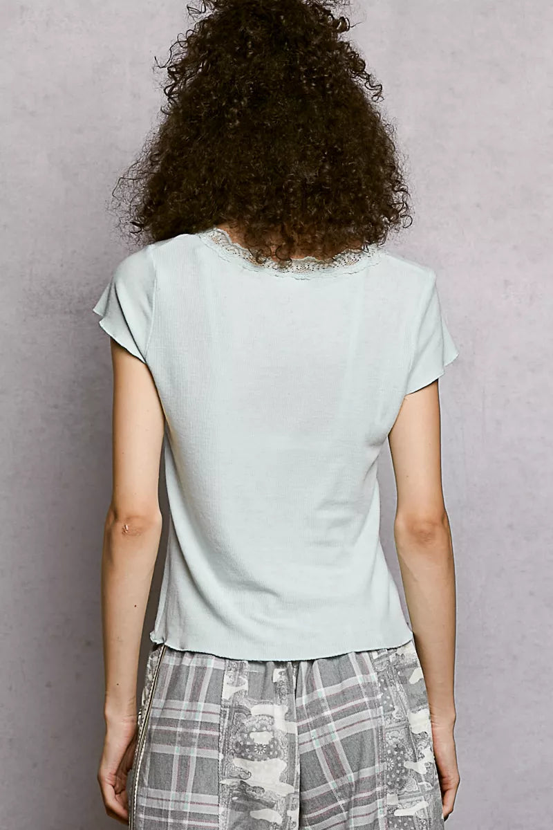 POL Round Neck Short Sleeve Crop T-Shirt with Lace Trim - POWDER BLUE / S