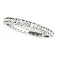 Featuring,  an antique-inspired design,  this diamond wedding band showcases delicate border detailing made of 14k white gold.