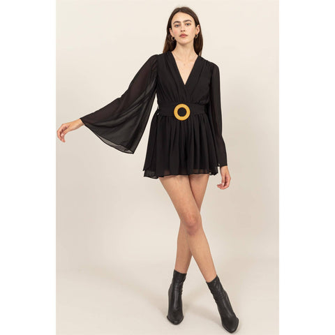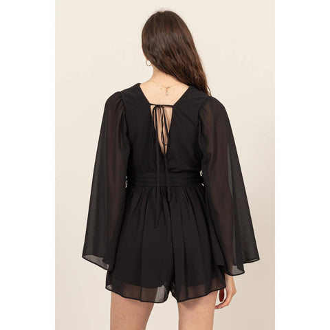 Plunging Neckline Bell Sleeve Romper - BLACK / S-M-L(2-2-2)