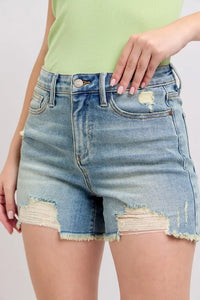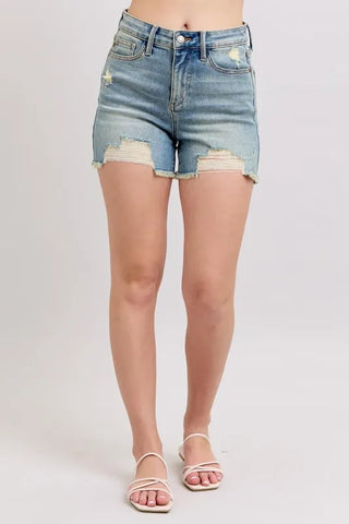 Judy Blue Full Size High Rise Washed Fly Stitch Detail and Destroy Denim Shorts Plus Size - MD / L