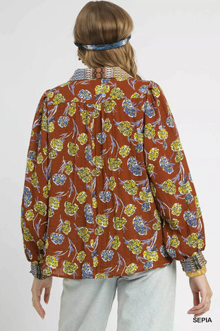 Umgee Floral Print Collar Blouse - SEPIA / S