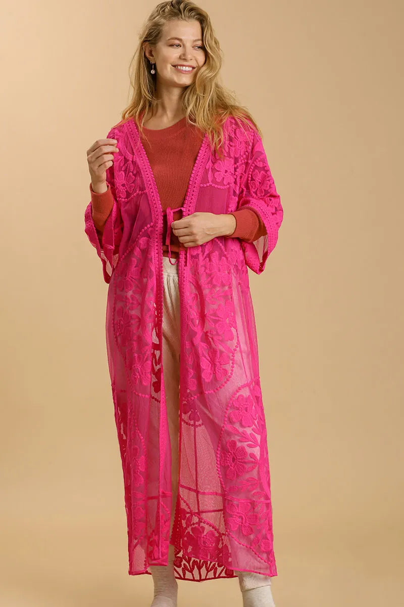 Umgee Full Size Floral Lace Open Front Long Kimono with Waist Tie Plus Size - Hot Pink / M
