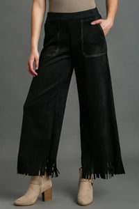 Umgee Full Size Suede Fringe Hem Wide Leg Pants Plus Size - Black / XL