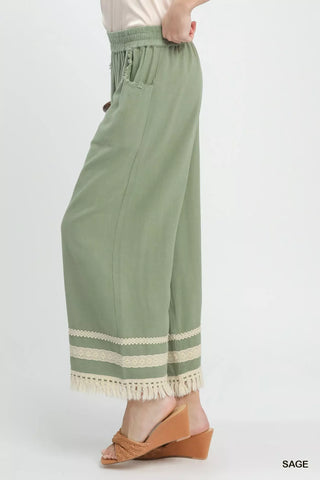 These wide-leg pants are made from a comfortable linen blend that is perfect for warm weather. The addition of lace trim adds a stylish and feminine touch to the design. With side pockets for convenience, these pants strike the perfect balance between fashion and functionality. While they are not lined, they are still a great choice for a chic and comfortable outfit. Embrace a bohemian vibe with these fringe hem wide-leg pants that are sure to elevate your casual wardrobe.
