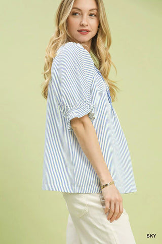 A stripe V-neck top is a timeless and versatile piece that combines classic stripes with a flattering V-neckline. The stripes add a chic and effortless appeal to the top, while the V-neck design elongates the neckline and creates a flattering silhouette. This style is perfect for both casual and dressed-up looks, making it a versatile wardrobe essential. Pairing the stripe V-neck top with jeans for a casual outing or with trousers for a more polished ensemble can result in a stylish and put-together outfit. Overall, a stripe V-neck top is a versatile and stylish option that can be easily incorporated into various outfits for a classic and on-trend look.