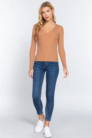 This V-neck fitted viscose rib knit top is a stylish and versatile wardrobe staple. Made from soft and lightweight viscose fabric, it offers a comfortable and flattering fit. The rib knit design adds texture and visual interest to the top, while the V-neckline adds a touch of femininity. Perfect for layering or wearing on its own, this top can be dressed up or down for any occasion. Pair it with high-waisted trousers or a skirt for a sophisticated look, or style it with jeans for a casual yet chic outfit. Whether you're headed to the office, meeting friends for brunch, or going out for a night on the town, this fitted viscose rib knit top is a timeless and stylish choice.