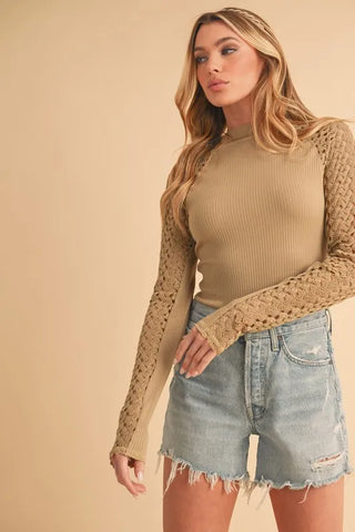 Aemi+Co Mock Neck Ribbed Knit Top with Crochet Sleeve - Tan / S