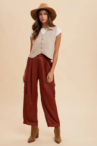 Wide leg cargo satin pants are a versatile and stylish choice for a trendy and modern outfit. The wide leg design offers a flattering silhouette and comfortable fit, perfect for both casual and dressed-up looks. The satin fabric adds a luxurious touch to the pants, making them a chic and sophisticated addition to your wardrobe.