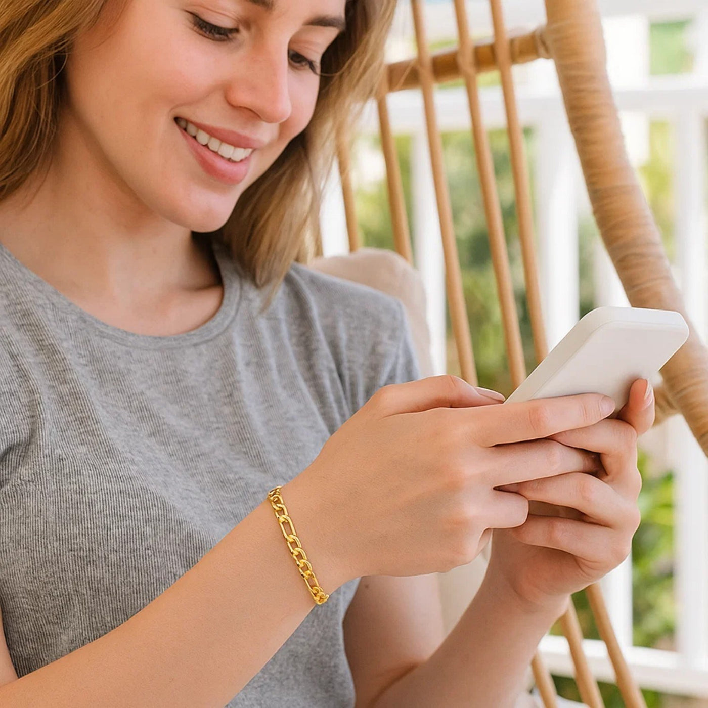 This solid Figaro bracelet comes in 14k yellow gold and has a width of 4.5 millimeters. Secured with a lobster clasp.