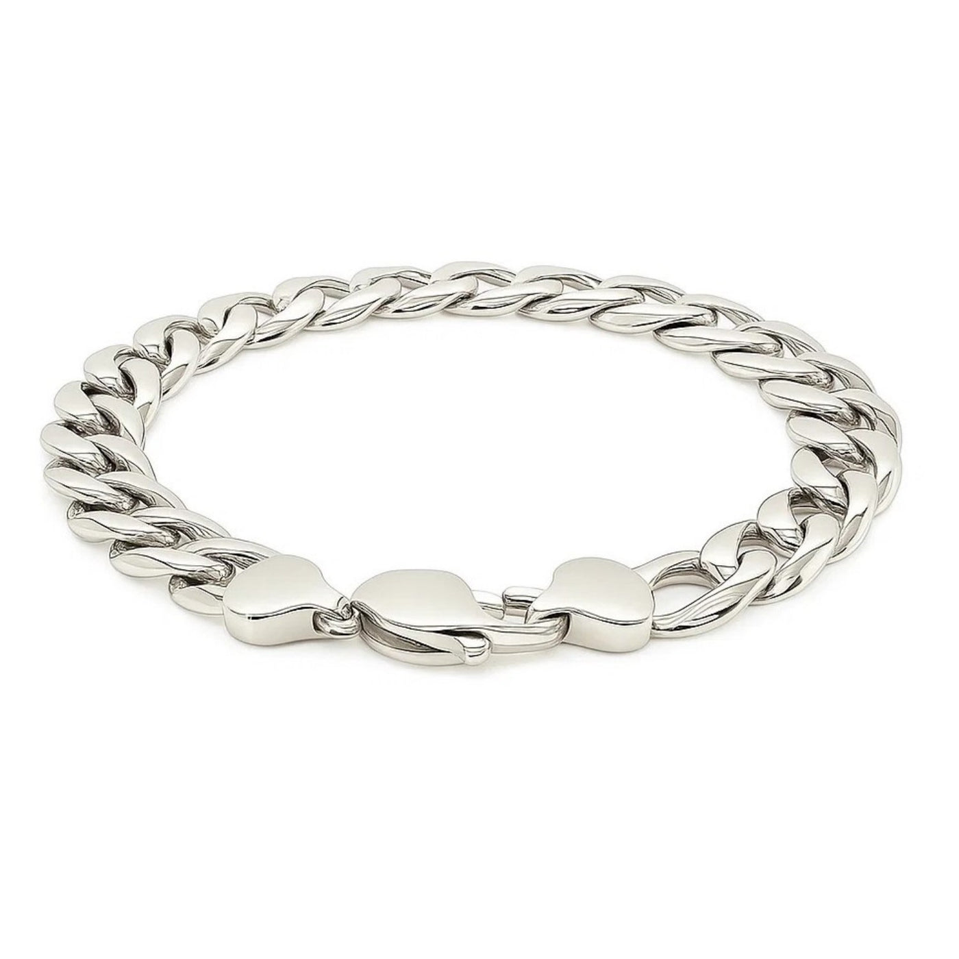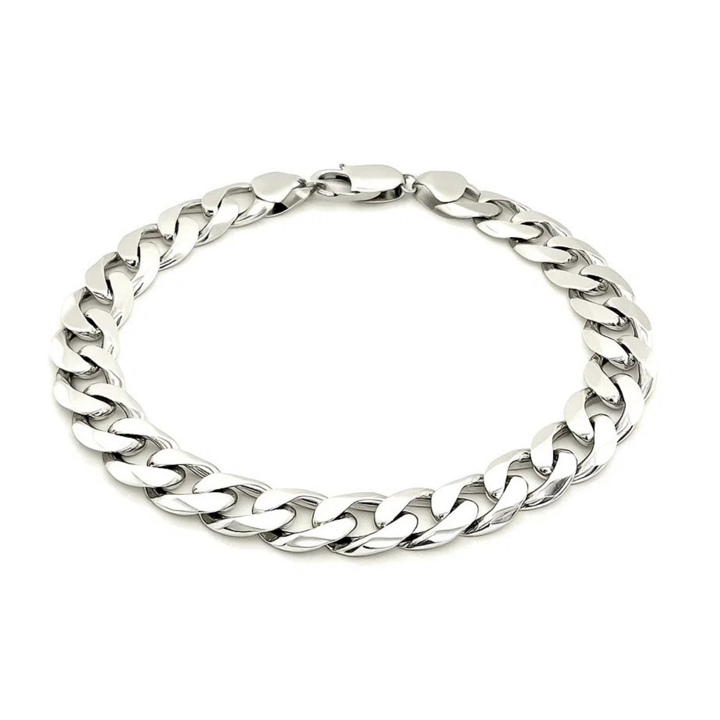 This classic rhodium-plated bracelet is crafted in gleaming sterling silver and has a width of 11.6 millimeters. Featuring a curb bracelet design, it is secured with a lobster clasp.