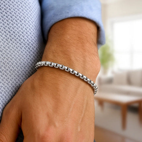Rhodium plated round box bracelet crafted in sterling silver measuring 5.2 millimeters in width. Bracelet is 8 1/2 inches long and closes with a lobster clasp.