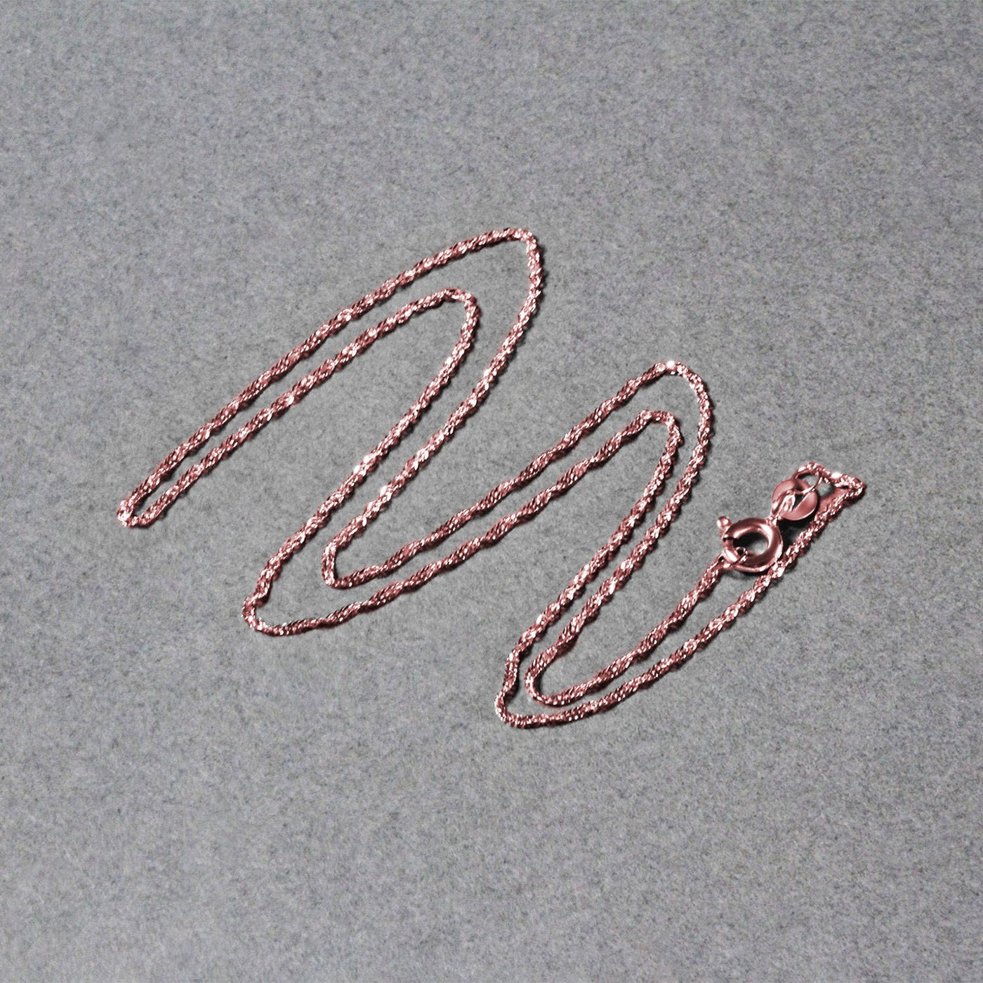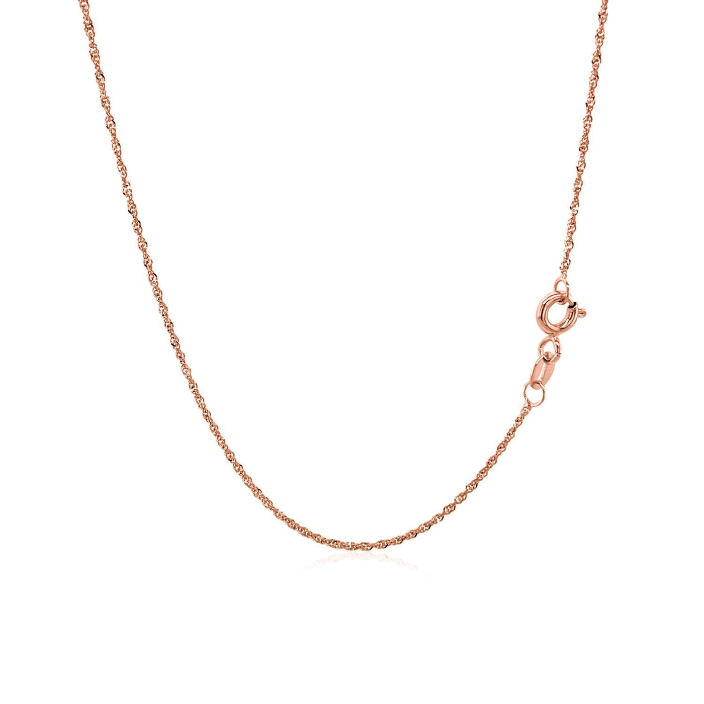This Singapore chain comes in 14k rose gold and has a width of 1.10 millimeters.