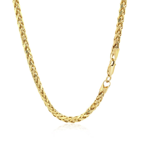 This diamond cut round franco chain comes in 14k yellow gold and has a width of 3.20 millimeters.