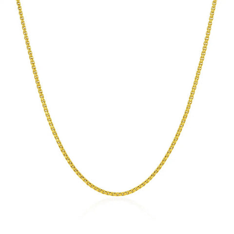 This round box chain comes in 14k yellow gold and has a width of 1.3 millimeters.