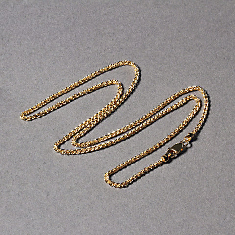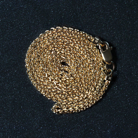 This round wheat chain comes in 14k yellow gold and has a width of 1.5 millimeters.