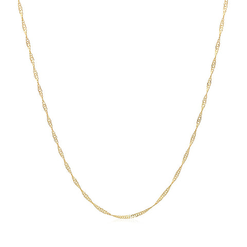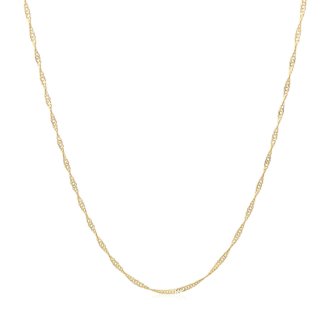 This Singapore chain comes in 14k yellow gold and has a width of 0.60 millimeters.