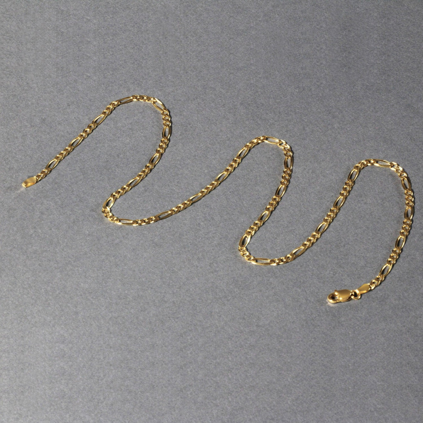 This solid Figaro chain comes in 14k yellow gold and has a width of 3.00 millimeters.