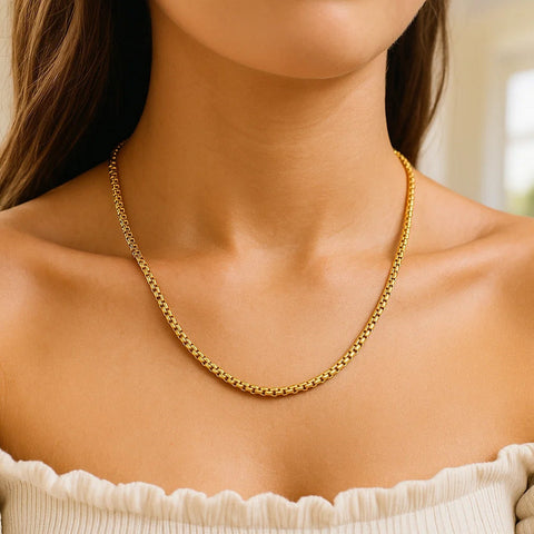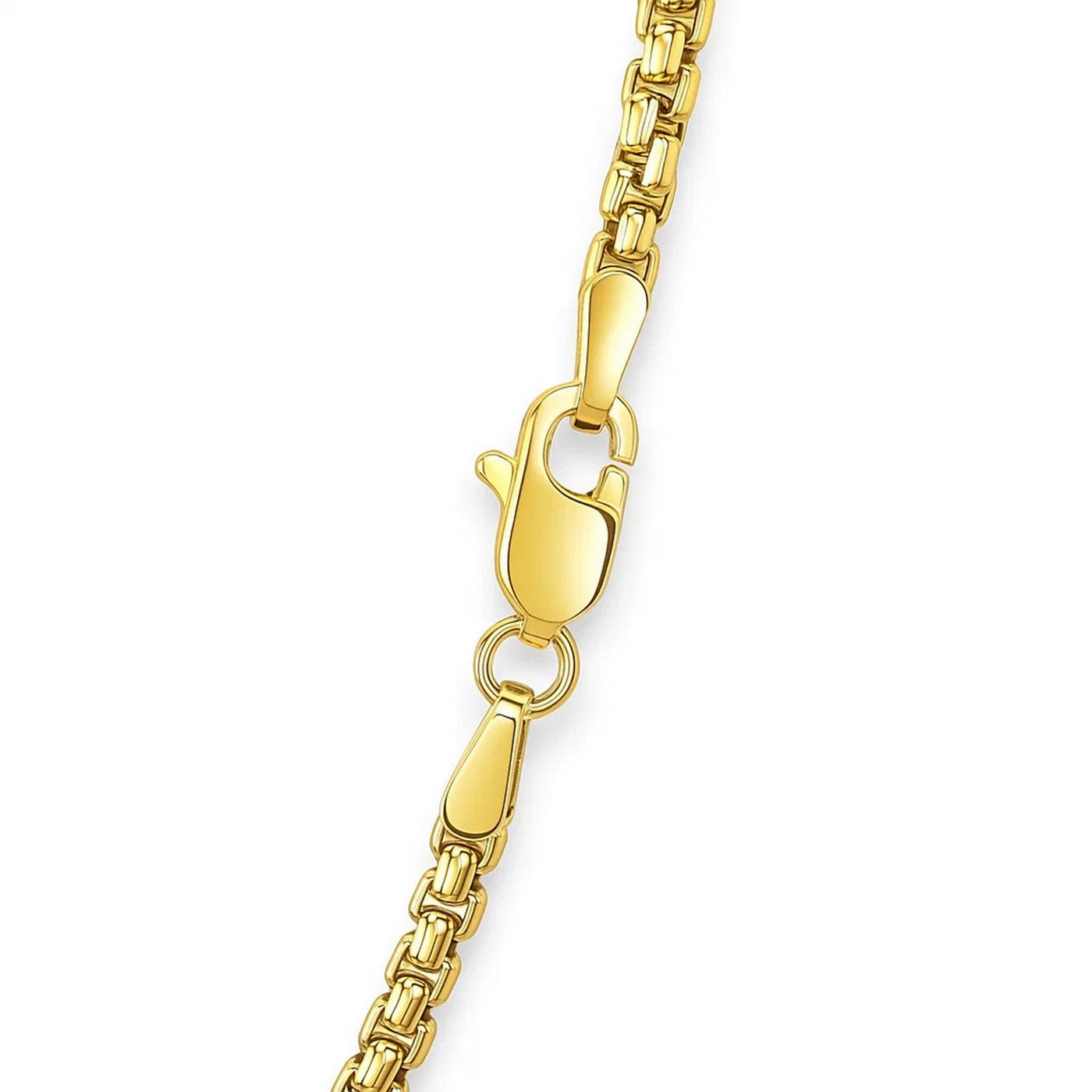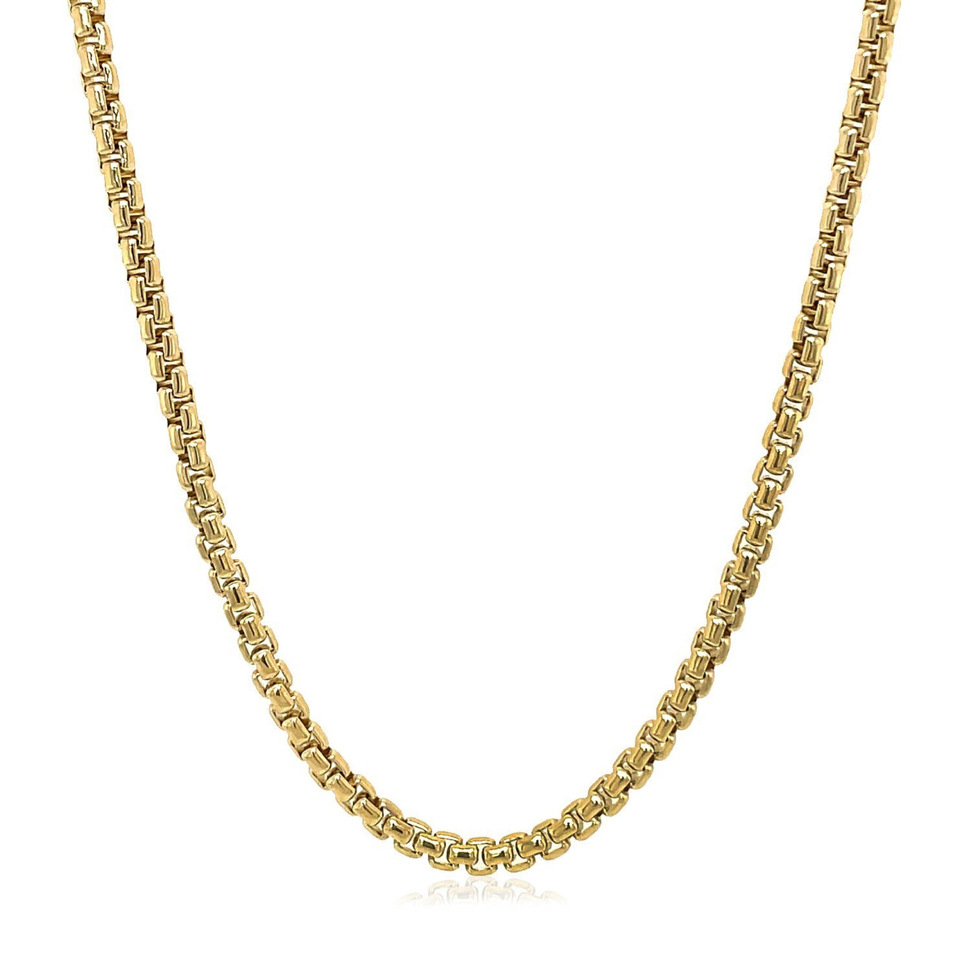 This round box chain comes in 14k yellow gold and has a width of 3.6 millimeters.