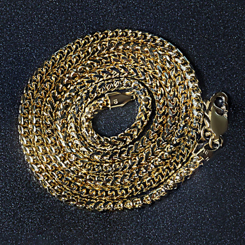 This solid diamond cut round franco chain comes in 14k yellow gold and has a width of 2.70 millimeters.
