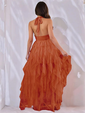 Halter Neck Irregular Mesh Dress - Pumpkin / S