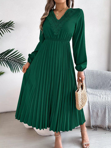 Lace Detail V-Neck Pleated Dress - Dark Green / S