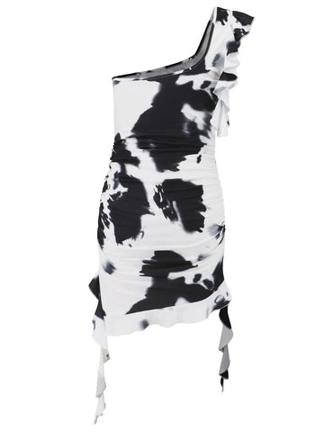 Ruffled Tie-Dye Single Shoulder Mini Dress - Black / S