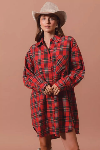 This Red Plaid Oversized Shirt Dress is a stylish and comfortable choice for any occasion. Made from a soft and breathable fabric, this dress features a classic plaid pattern, button-down front, and chest pocket detail. The oversized fit and shirttail hem add a touch of casual flair, while the long sleeves make it perfect for layering. Dress it up with heels or keep it casual with sneakers for a versatile look.