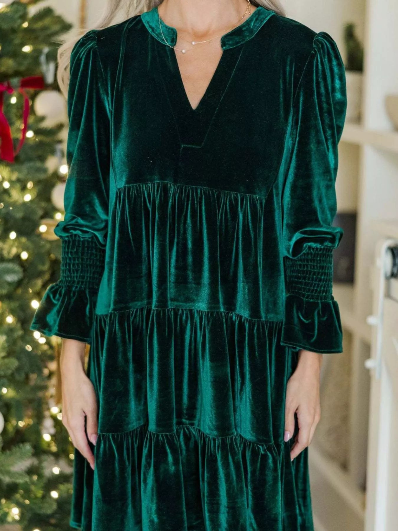 Velvet Tiered Notched Mini Dress - Dark Green / S
