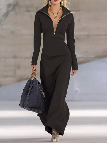 Zip Collar Long Sleeve Maxi Dress - Beige / S