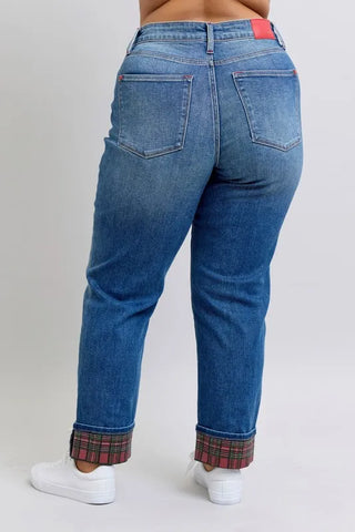 Judy Blue Full Size Mr Plaid Print Cuff Bf Jeans Plus Size - Medium / 0(24)