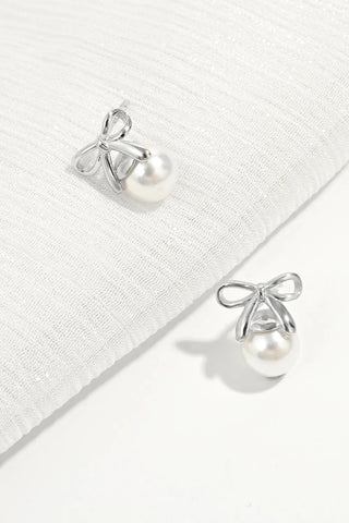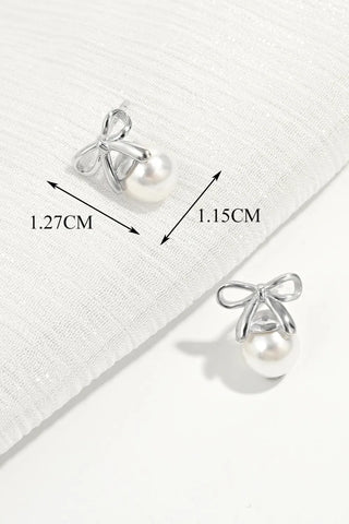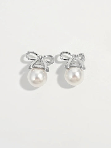 925 Sterling Silver Pearl Bow Earrings - Silver / One Size