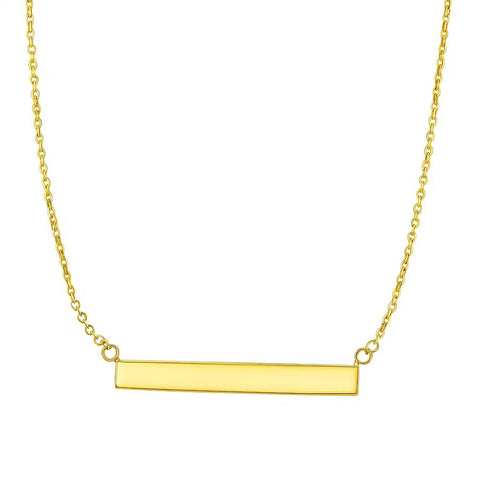 The delicate chain beautifully highlights the 1.7x19.8 millimeters polished horizontal bar element of this gorgeous necklace. Made of 14k yellow gold,  this measures 18 inches and secured with a spring ring lock.