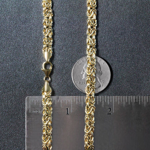 Showcasing, an intricately designed byzantine chain this gorgeous necklace radiates style and grace. Made of 14k yellow gold, this comes in size 18 inches and secured with a lobster lock.