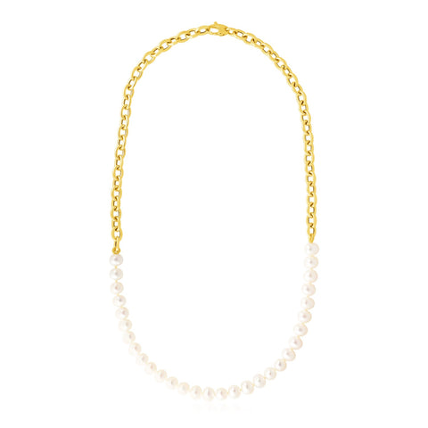 An inspiring row of pearls contrasts elegantly with luminous 14k yellow gold chain links in this stunning and unique necklace. Necklace is 18 inches long and closes with a lobster clasp.