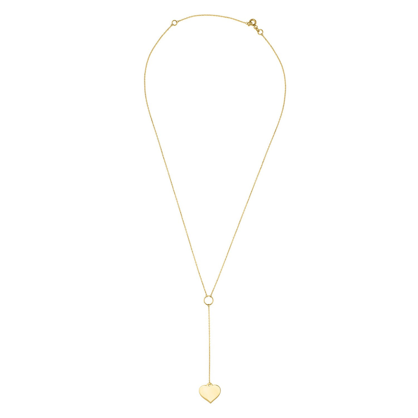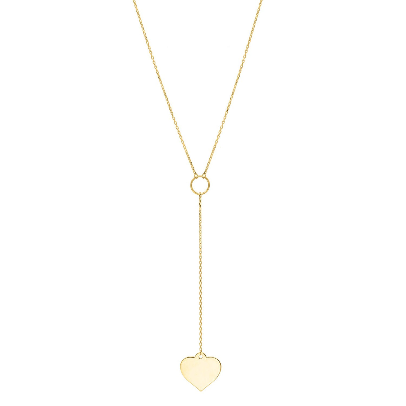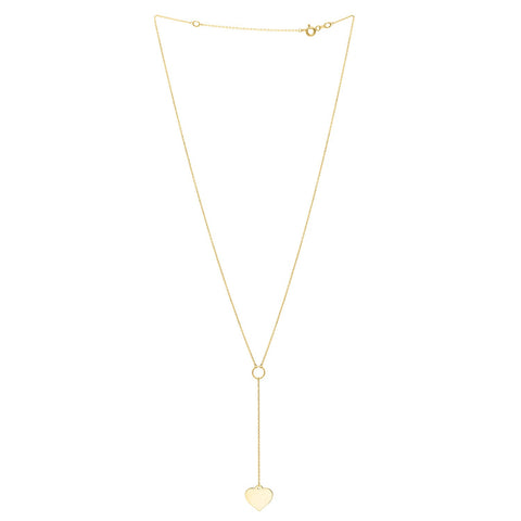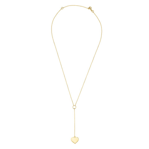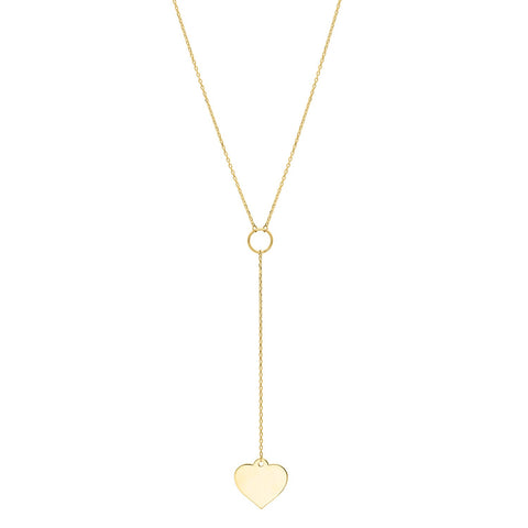 This 10k yellow gold heart lariat necklace showcases a polished chain with a delicate, dangling heart as its striking focal point. The 18 inches chain complements its fluid design, allowing it to drape beautifully. Perfect for layering or wearing on its own, this piece combines versatility with a distinctive touch of elegance.