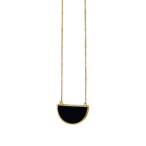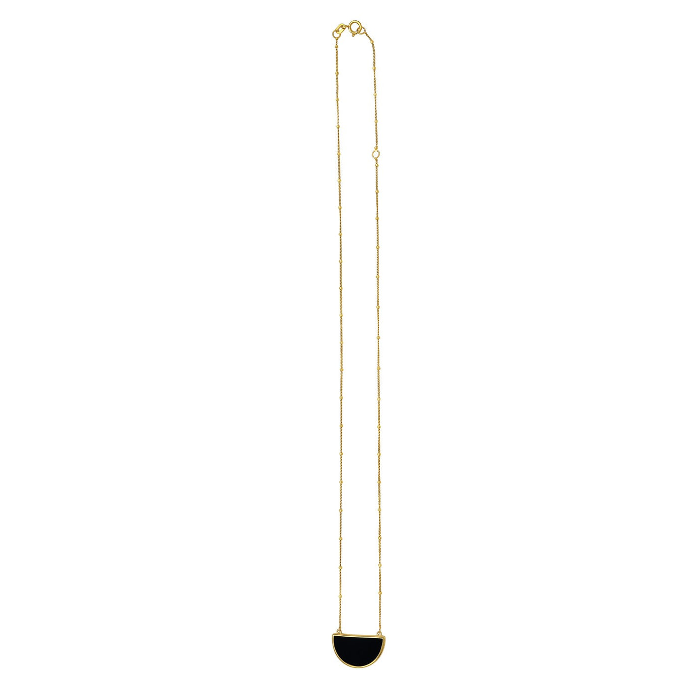 Striking and refined, this 14k yellow gold geometric necklace features a half-moon black onyx pendant encircled by a gold frame suspended on a delicate beaded station chain. With its thoughtful design, it adds a touch of celestial charm to effortlessly elevate your look. Secured with a spring ring clasp closure.