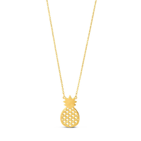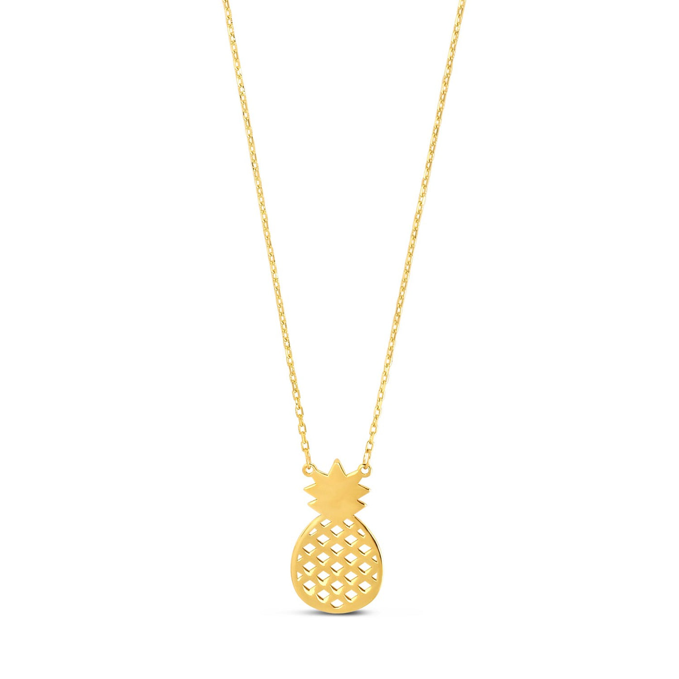 Radiating joy, this 10k yellow finish necklace features a stationed polished pineapple pendant, symbolizing the spirit of abundance and celebration. Set on an 18 inches chain with a spring ring clasp and an adjustable jump ring at 16 inches, it’s a bright piece that carries a warm and welcoming message wherever you go.