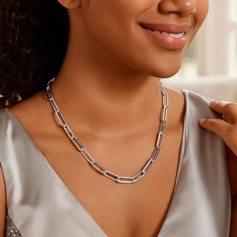Destined to become a classic, the polish of classic sterling silver meets the modern intrigue of paperclip chain in this beautiful necklace. Necklace is 18 and 38 inches long, 5.9mm wide, and closes with a lobster clasp.