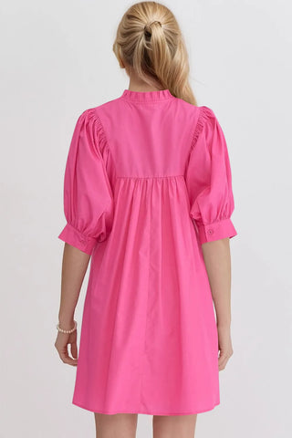 Oh Frill Notched Puff Sleeve Babydoll Mini Dress - Hot Pink / M