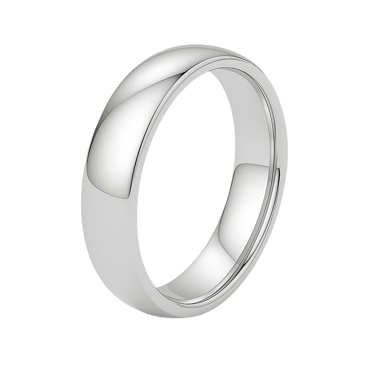 Traditional symbolism meets modern comfort and practicality in this elegant 14k white gold wedding band. Band is 5mm wide and is available in ring sizes 6 to 12.